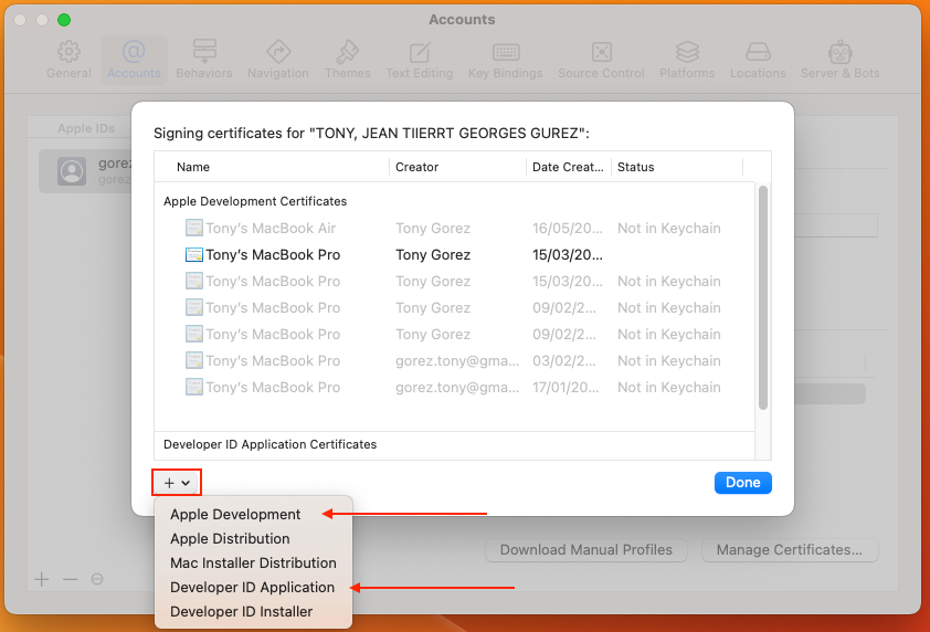 A modal will appear, and from there, you can create either an "Apple Development" or "Developer ID Application" certificate using the "+" button.