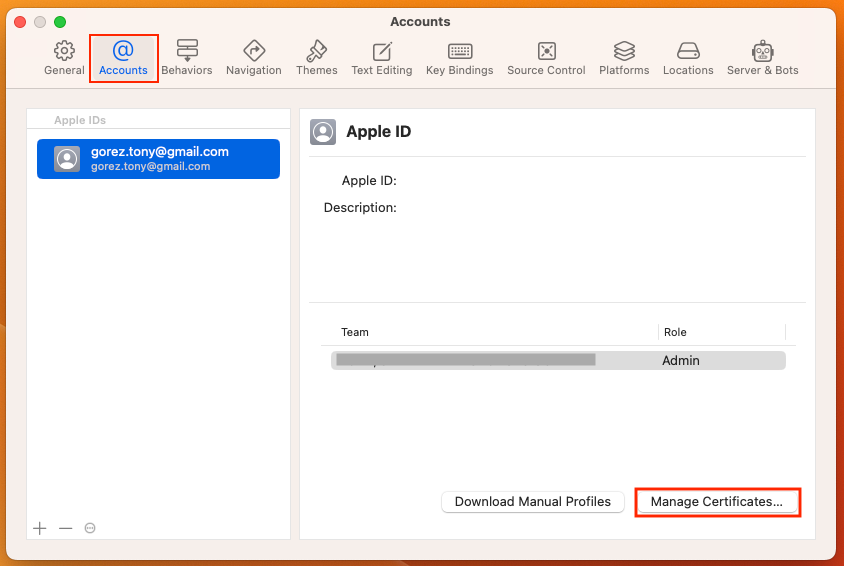On the "Accounts" tab, click on the "Manage Certificates" button: