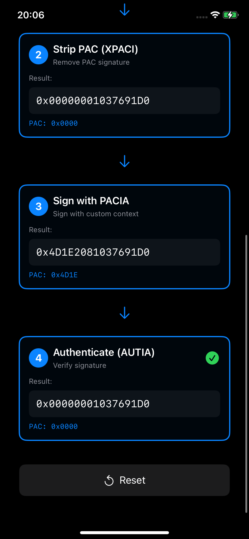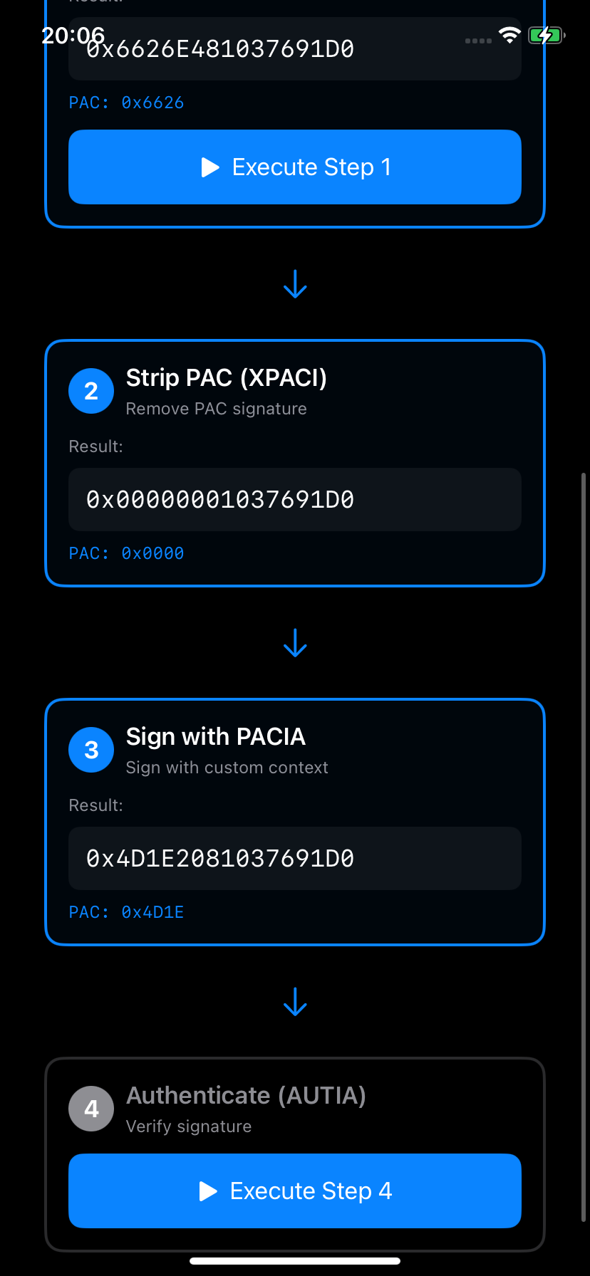 Whether you're experimenting with inline assembly or using the visual demo app, understanding PAC helps us appreciate the sophisticated security mechanisms in modern iOS and how they raise the bar for exploitation. The interactive nature of the demo makes these concepts tangible and easier to grasp than reading code alone.